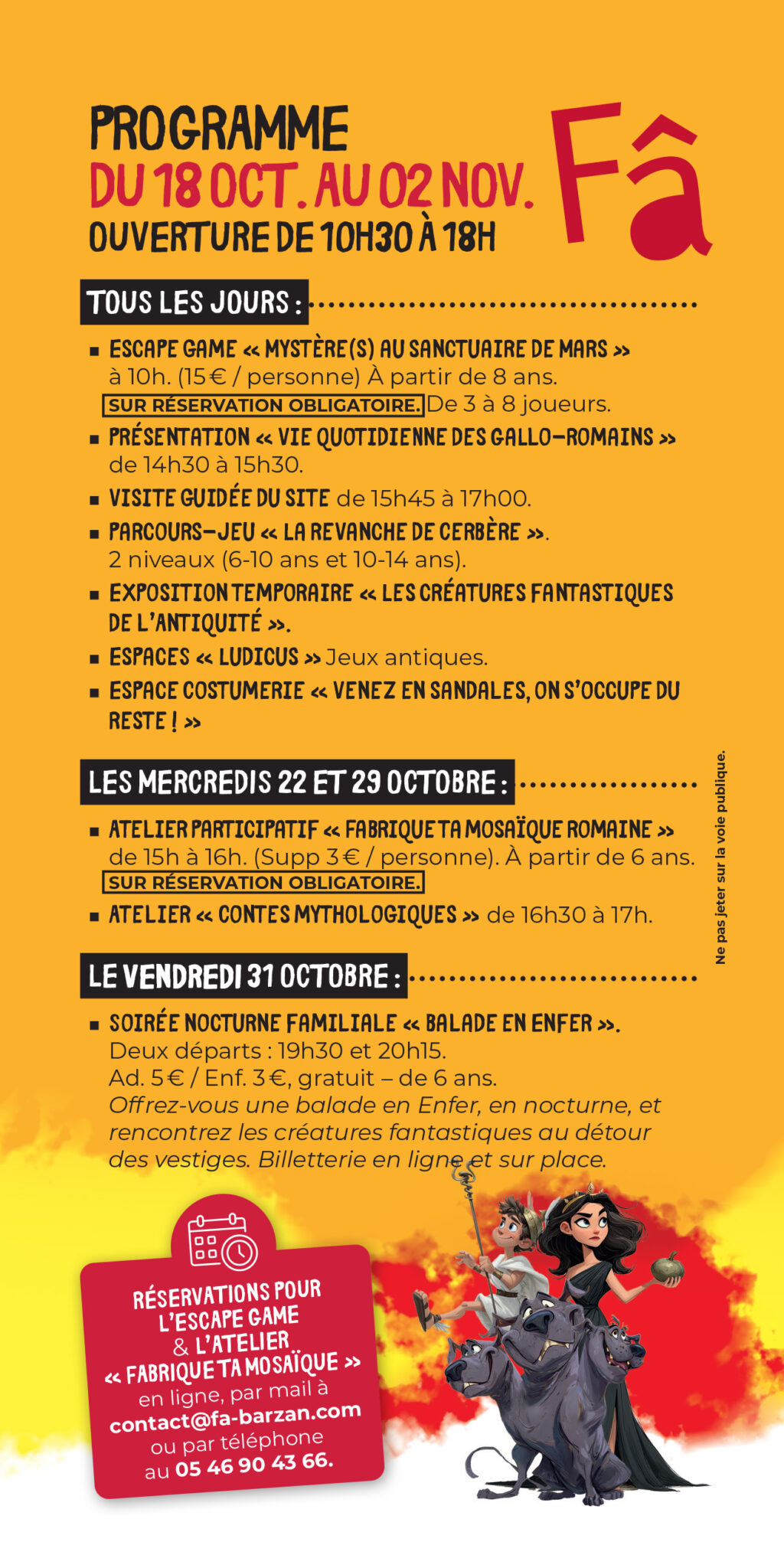 Pendant les vacances de Toussaint, du 18 octobre au 2 novembre, le site gallo-romain du Fâ est ouvert tous les jours, de 10h30 à 18h.